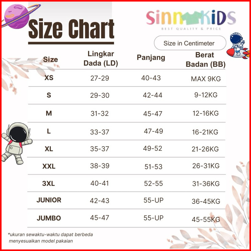 XS (7pcs), S (6pcs), M (5pcs), L (5pcs), XL (5pcs), XXL (4pcs), 3XL (4pcs), Junior (4pcs), New Born (7pcs), Junior jumbo (4pcs)