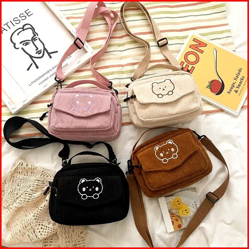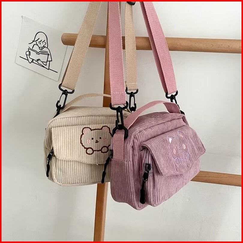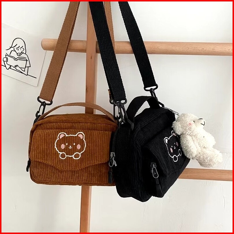 Tas Selempang Wanita Corduroy Korean Look Cute Sling Bag Perempuan Slingbag Motif Beruang Tas Tangan Vintage