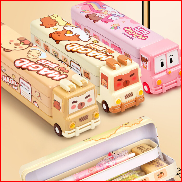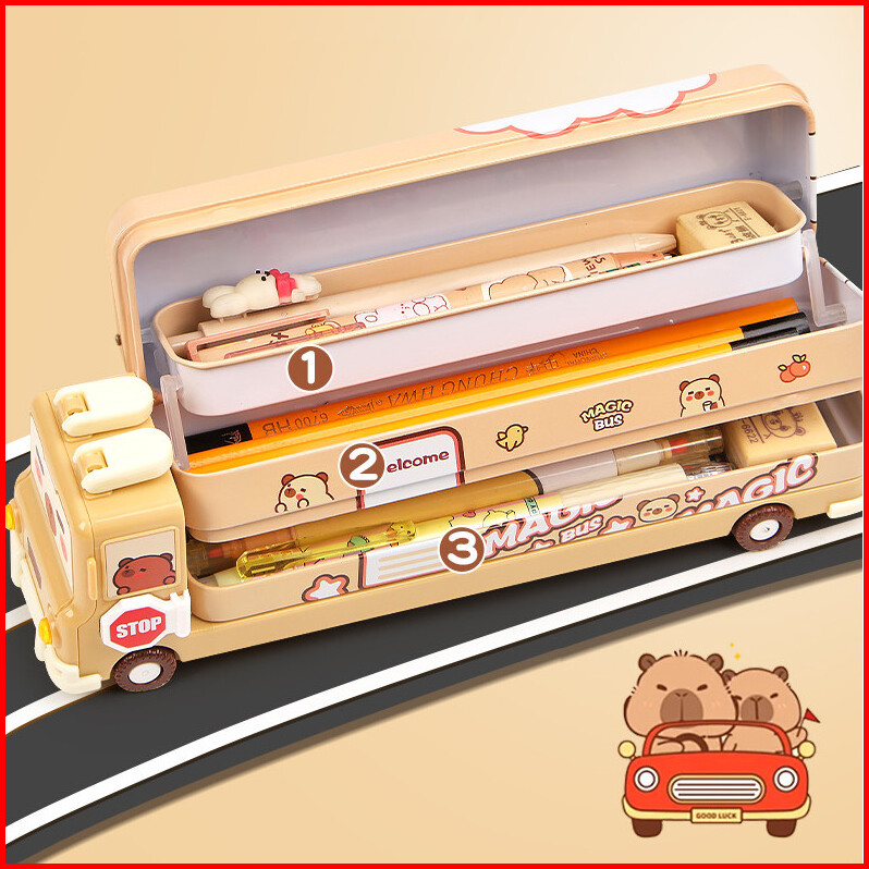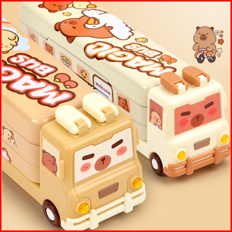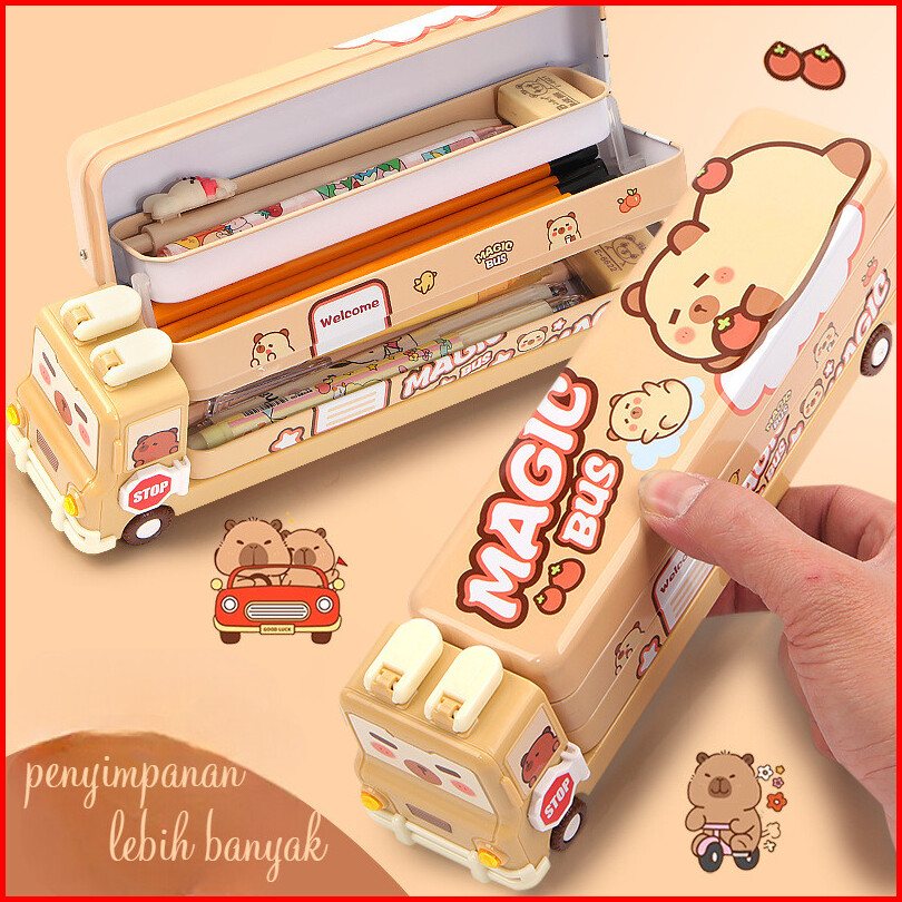 Cratk Tempat Pensil Kaleng Unik Dan Lucu Tempat Pensil 3 Tingkat Motif Capybara Warna Soft Brown Kotak Pensil Bus Capyba
