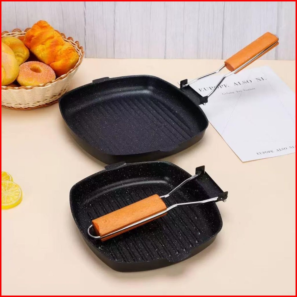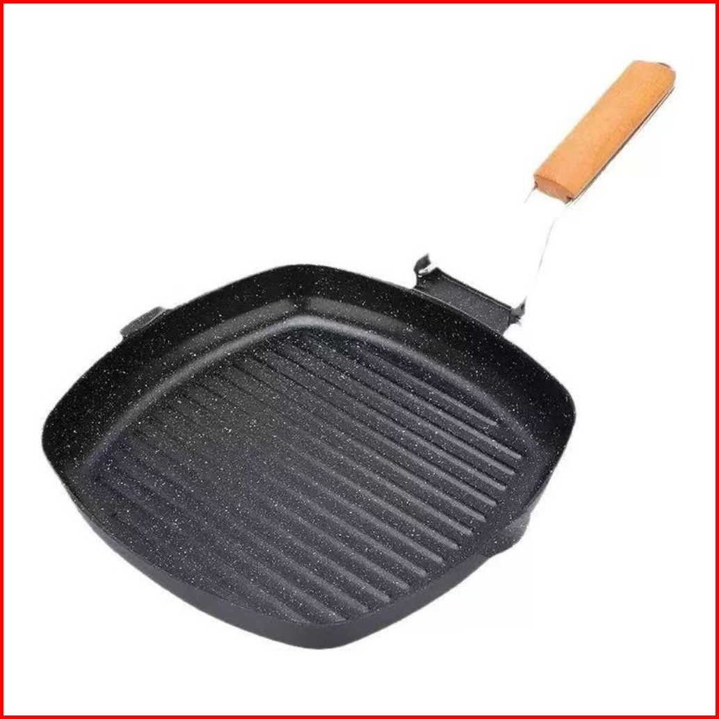 Square Grill Pan Teflon 20cm Panggang Wajan Anti Lengket Bbq Dengan Pegangan Kayu Untuk Memasak Telur Dan Sosis