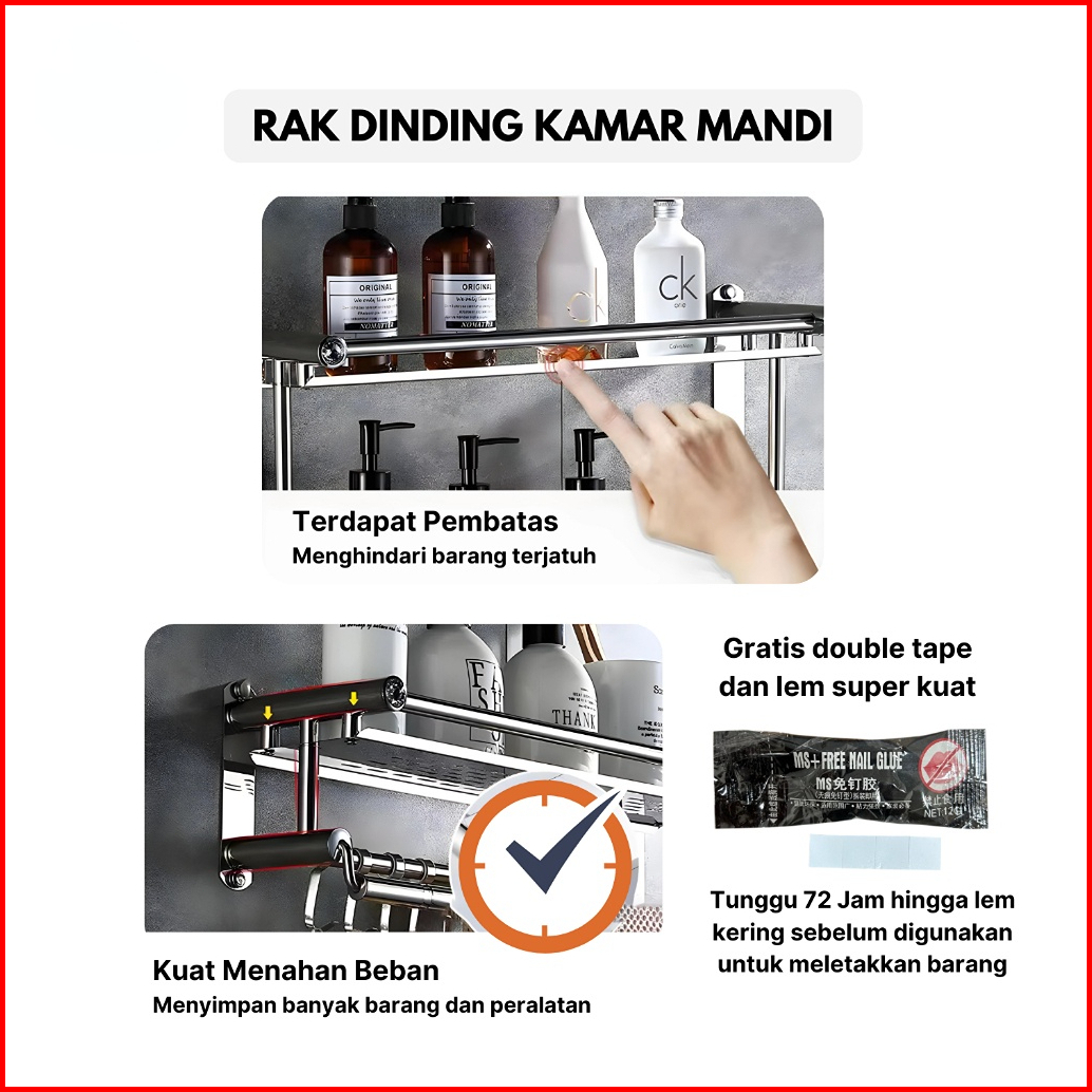 Rak Kamar Mandi Stainless Gantungan Handuk Model Tanpa Mesin Bor Sus304 Lem Super Kuat Rak Handuk Gantungan Dinding Stai