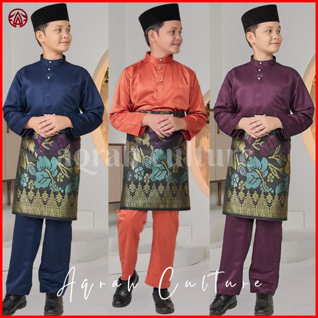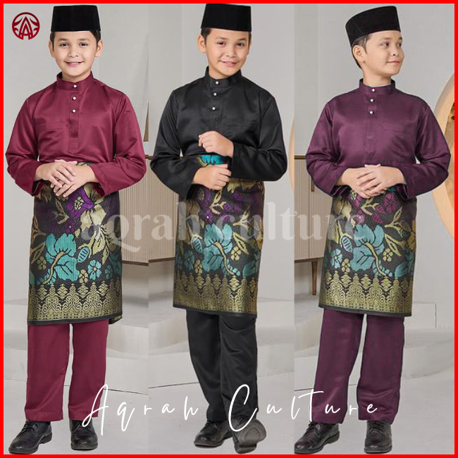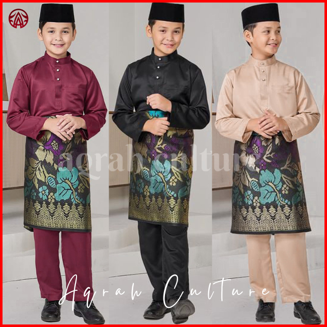 Azura Baju Melayu Anak Laki Laki Modern Bahan Satin Velvet Satu Set Pakaian Koko Muslim Kurta Cekak Musang Teluk Belanga