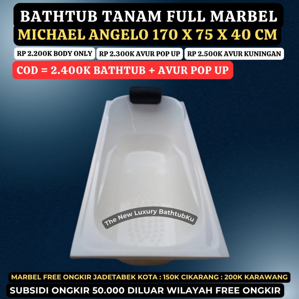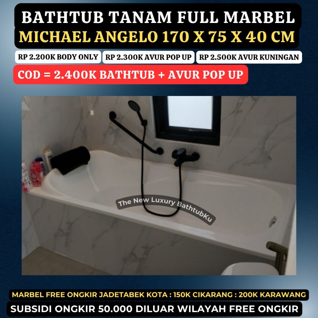 Bathtub Tanam 170x75x40 Cm Michael Angelo FULL MARBEL Free Bantal dan Avur Sesuai Pilihan, Pengiriman lebih diutamakan