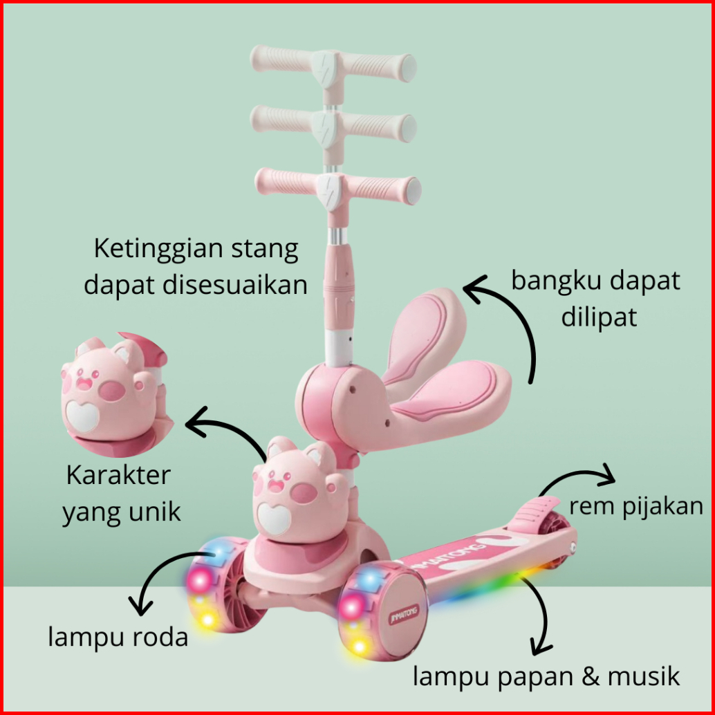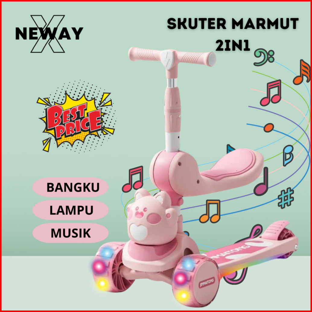 Newayx Skuter Mainan Anak Marmut Love 2 In 1 Scooter Lipat 2in1 Duduk Roda Tiga Lampu Musik Rem Toys