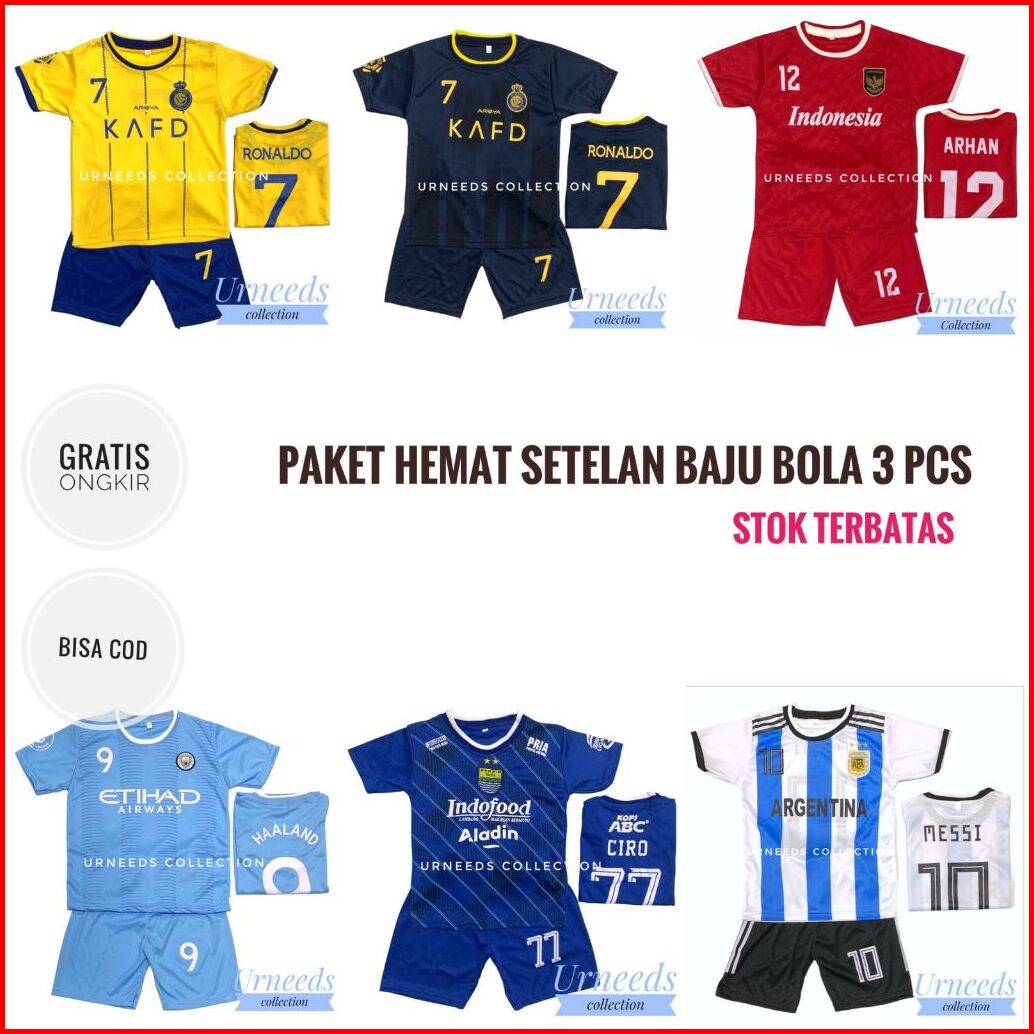 Paket Hemat Diskon 3pcs Setelan Baju Bola Anak Laki Laki Ronaldo Messi Neymar Arhan Berkualitas