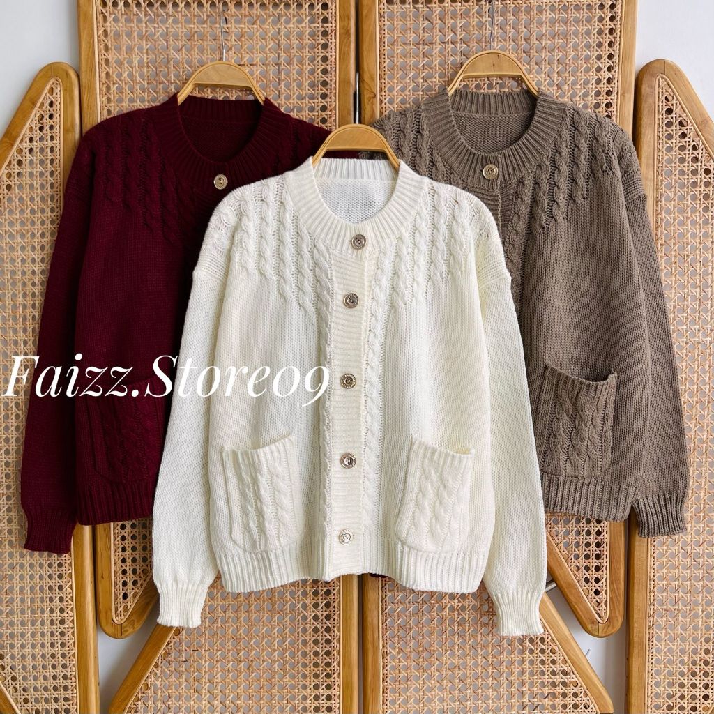 Teresia Cardy Knitwear - Outer Atasan Cardigan Rajut Kancing Saku Wanita Motif Cable Korean Style Premium