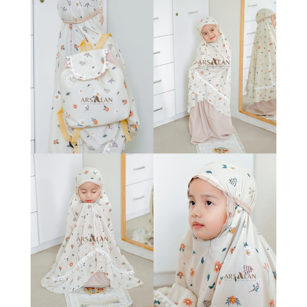 Mukena Anak Pompom Tas Ransel | Mukena Rayon kombinasi Mikro Anak SD Tanggung | Mukena Arsalan