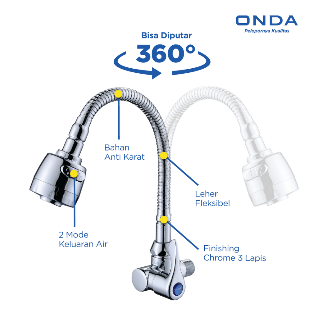 ONDA Kran Dapur Cuci Piring V 21 EG Tembok 1/2 In Kran Air Cuci Piring Stainless Anti Bocor Kran Pencuci Piring Leher Angsa Selang Fleksibel Keran Kamar Mandi