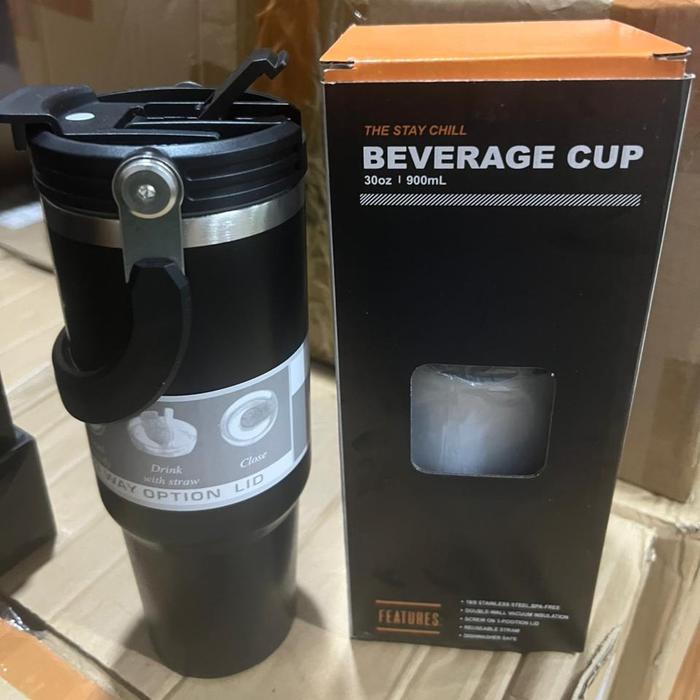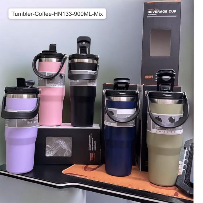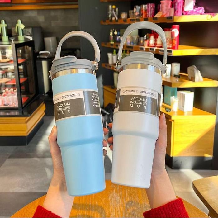 tumbler handle Stainless steel sus316L 900ml termos vacuum insulated premium+sedotan 2way minum - Hitam 600ml