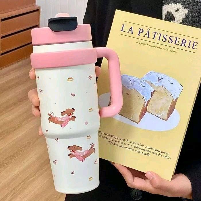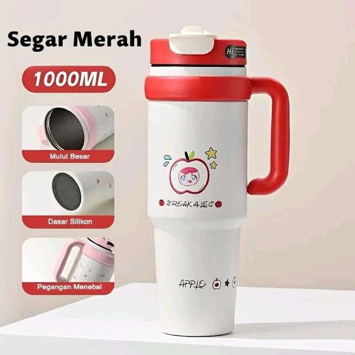 Tumbler Aesthetic 1000ML Motif Kucing Lucu / Tumbler Minum Stainless Steel Sus 304 Tahan Panas Dan Dingin - Merah