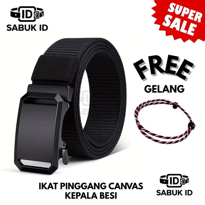 Ikat Pinggang Canvas Pria Kepala Besi – Sabuk Kuat Premium Anti Karat + Bonus Gelang gesper - HITAM