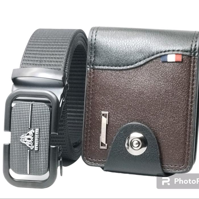 Gesper Sabuk Pria NYLON CANVAS rell Kepala besi 16b Plus Dompet mini kancing - Hitam