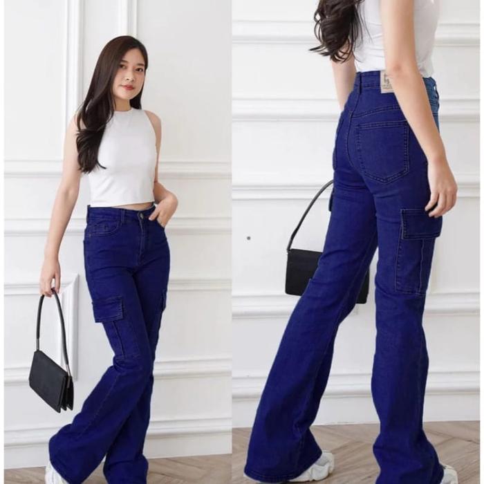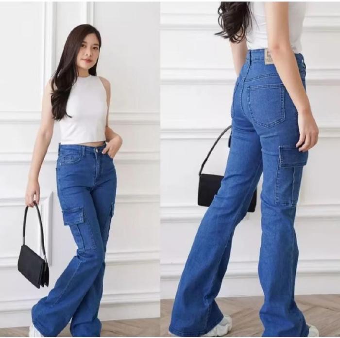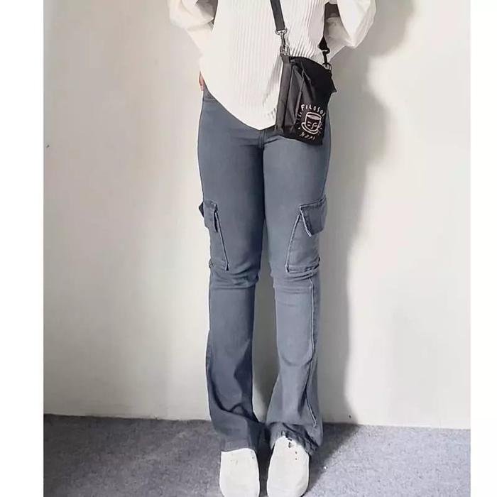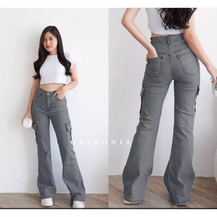 CELANA JEANS PANJANG CUTBRAY CARGO WANITA JUMBO KULOT CEWEK HIGHWAIST LOOSE STRETCH MELAR HITAM KARET DEWASA - GREY, 27