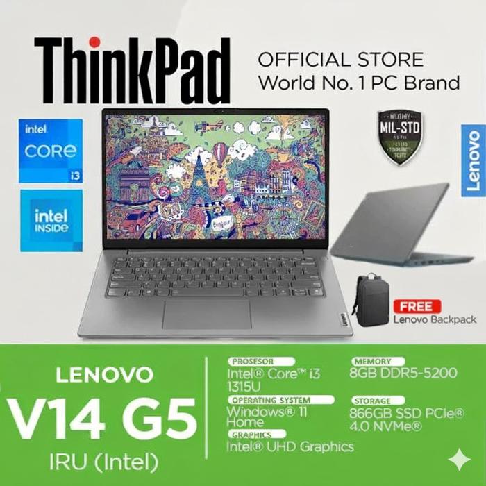 LENOVO V14 G5 IRU CORE I3 1315U 8GB 256GB SSD WINDOWS 11 14" FHD 2YR GREY LAPTOP MURAH -7AID - RAM 8GB, NORMAL BUNDLING