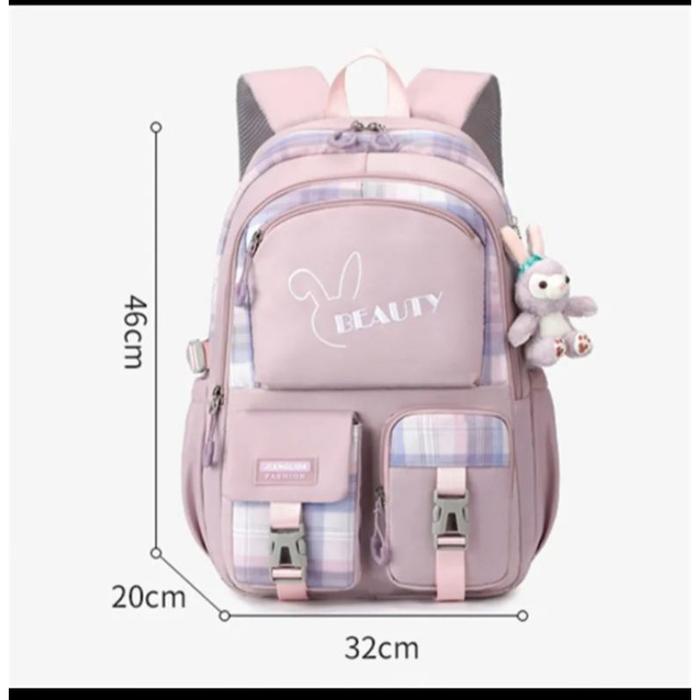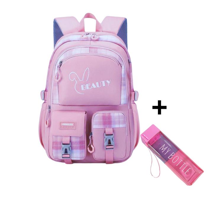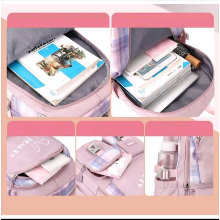 TAS RANSEL SEKOLAH PEREMPUAN TAS BEAUTY BACKPACK FASHION KOREA UNTUK ANAK SD SMP REMAJA FREE BOTOL MINUM MOTIF IMUT - UNGU MUDA