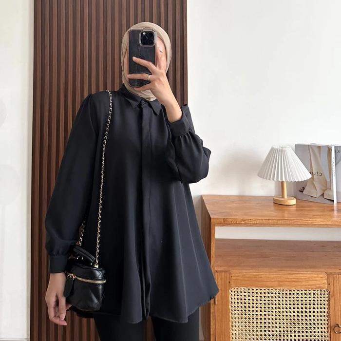 KINKA BLOUSE SHAKILA POLOS KEMEJA BASIC WANITA LENGAN PANJANG BAJU ATASAN MUSLIM KANCING - HITAM, M 100CM