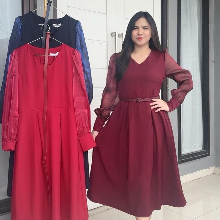 EMMA.BUTIK E00253 MIDI DRESS TWILL A-LINE DRESS LENGAN PANJANG MEWAH DRESS FORMAL KASUAL DRESS WANITA NYAMAN ELEGAN GAUN CASUAL BASIC BAJU KONDANGAN - NAVY, M