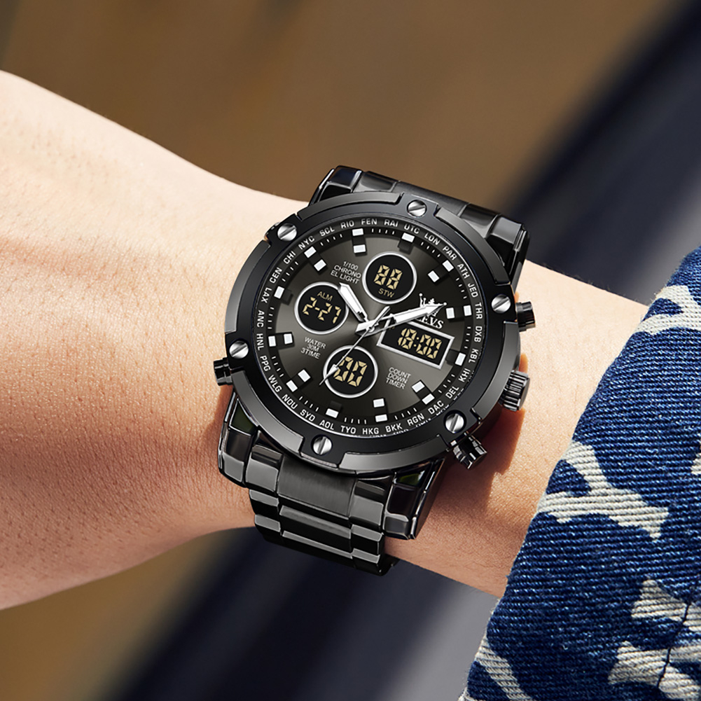 OLEVS Jam Tangan Pria Anti Air Original Digital Multifungsi Kronograf LED Alarm Tahan Air 30 Meter Hitam Men Watch