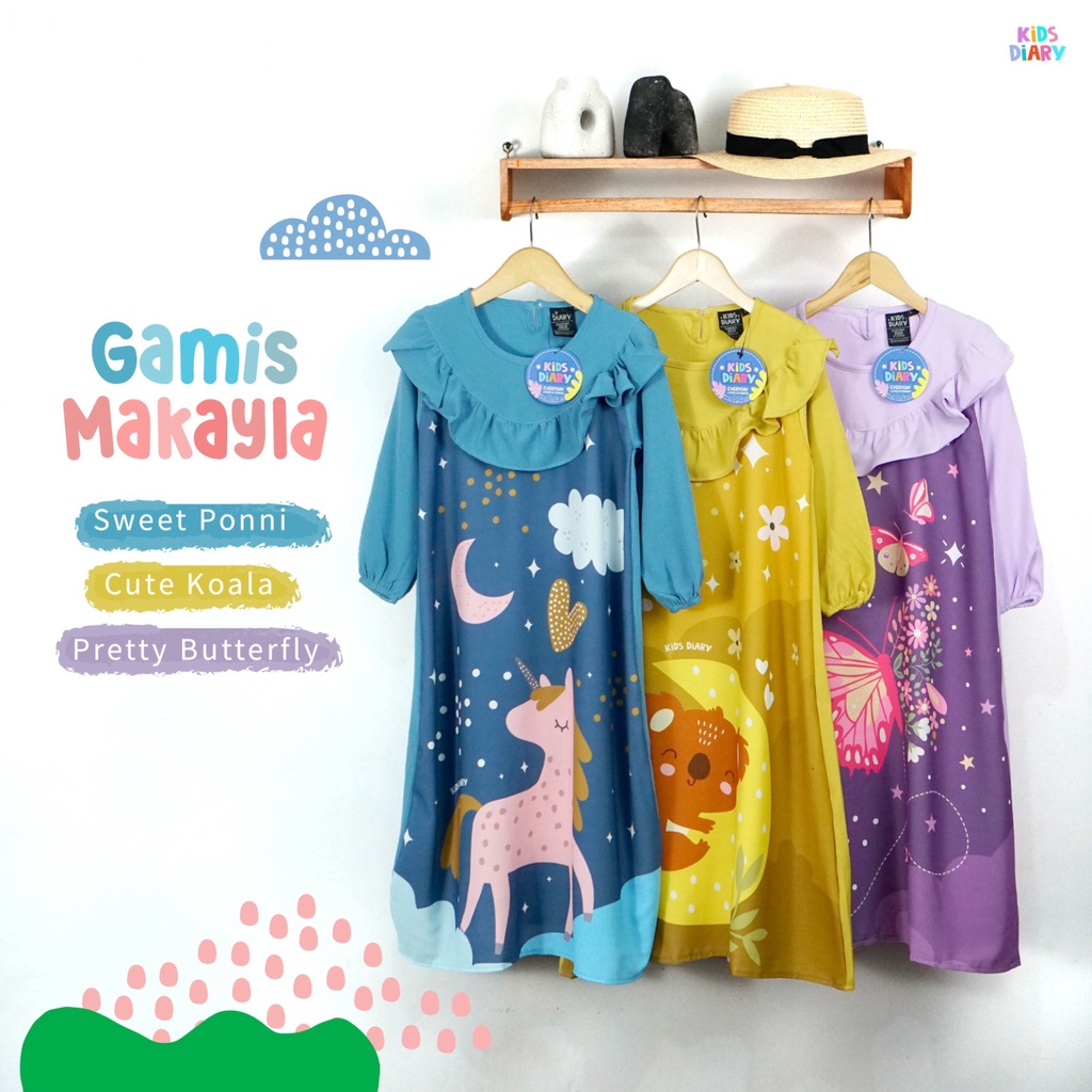 Kids Diary Plus - Gamis Anak Perempuan Makayla Motif Karakter 1-10 Tahun Stretch Digital Printing Ruffle Cantik Wudhu Friendly