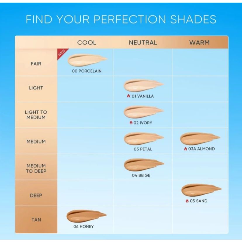 01-VANILLA, 02-IVORY, 03-PETAL, 03A-ALMOND, 04-BEIGE, 00-PORCELINE, 05-SAND, 06-HONEY