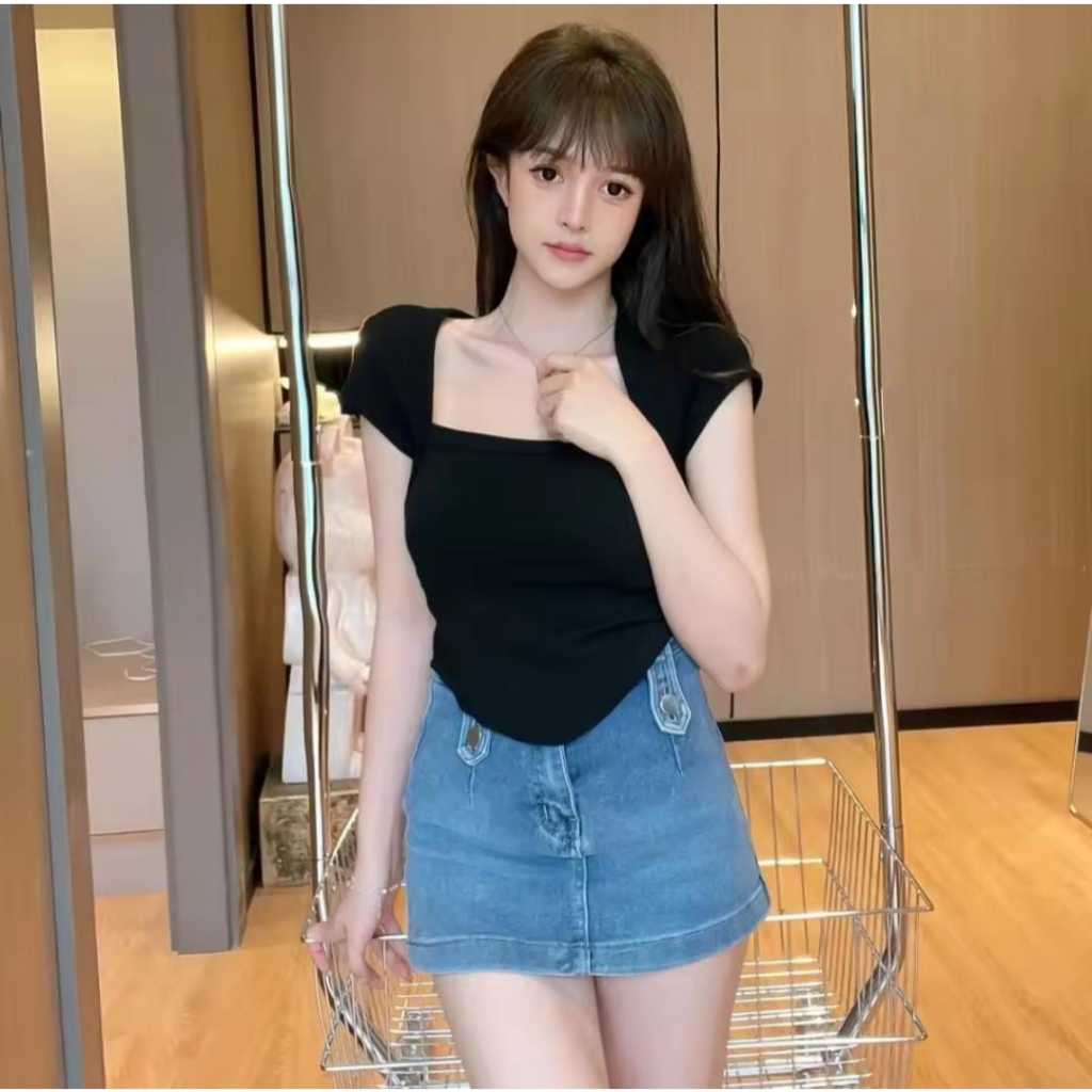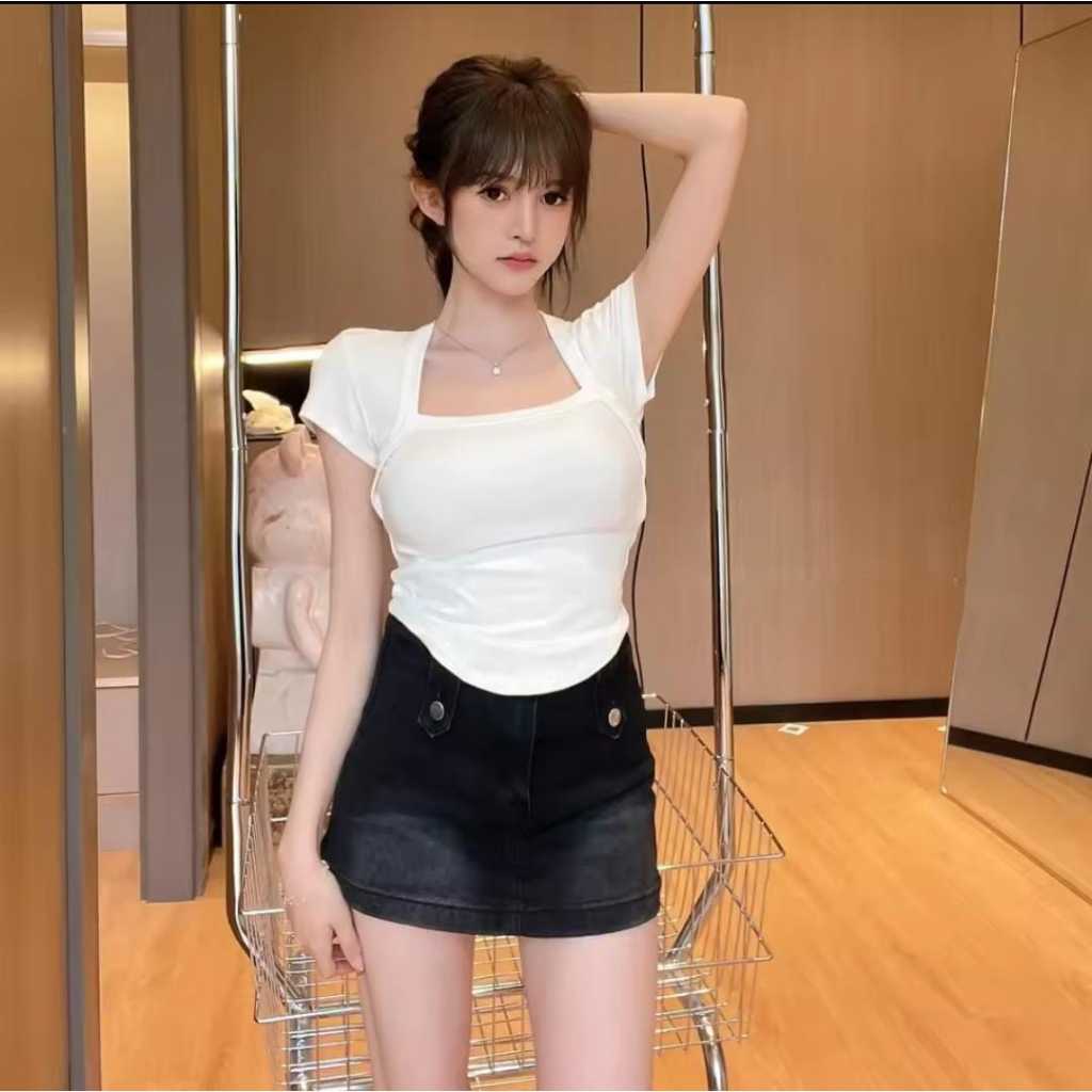 CECIL Top - Crop Top Square Neck Oval Lengan Pendek Korean Style - Kaos Crop Spandek Rayon 6032 6067