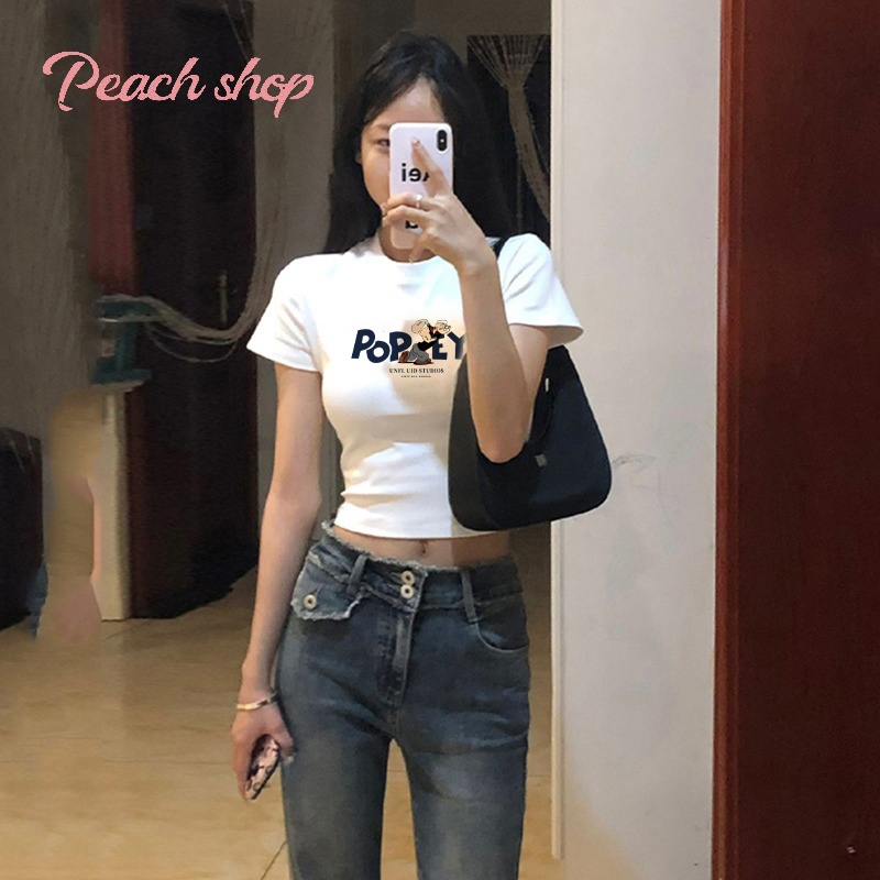 Peach Fashion Retro Popeye Kaos Crop Top Wanita Y2K Baju Croptee Korea