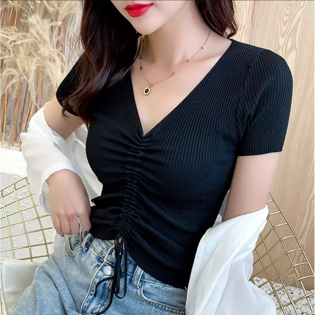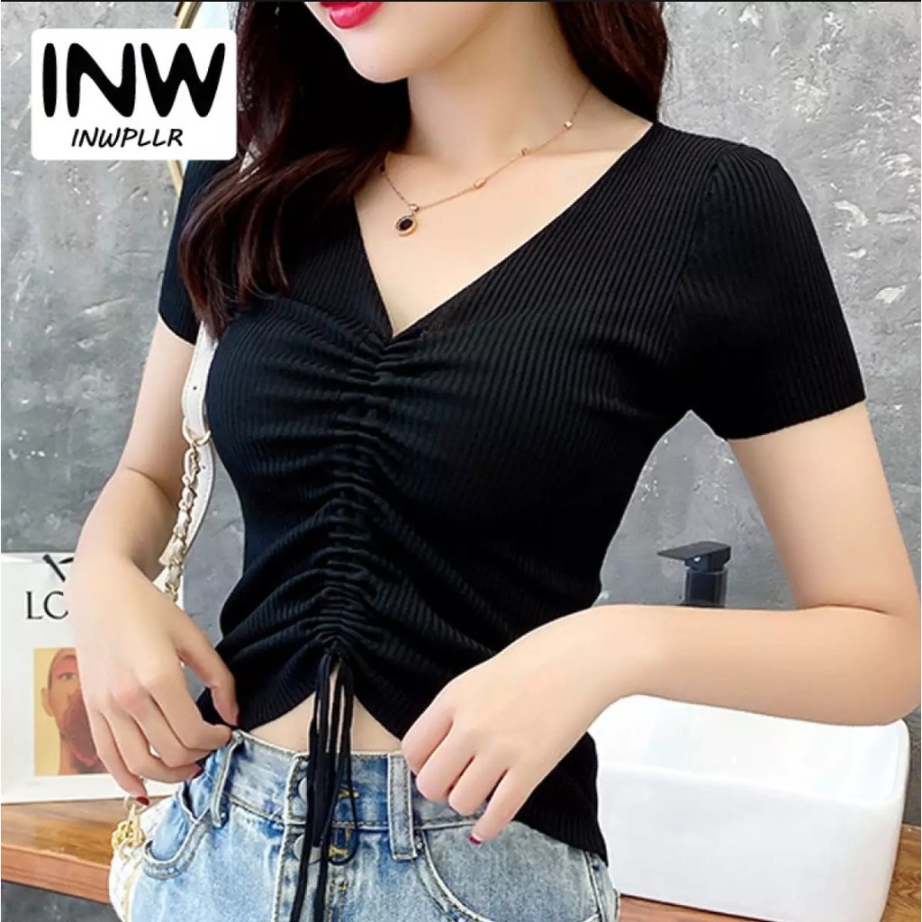 Crop Top Wanita VILLING Serut Depan Knit Rib