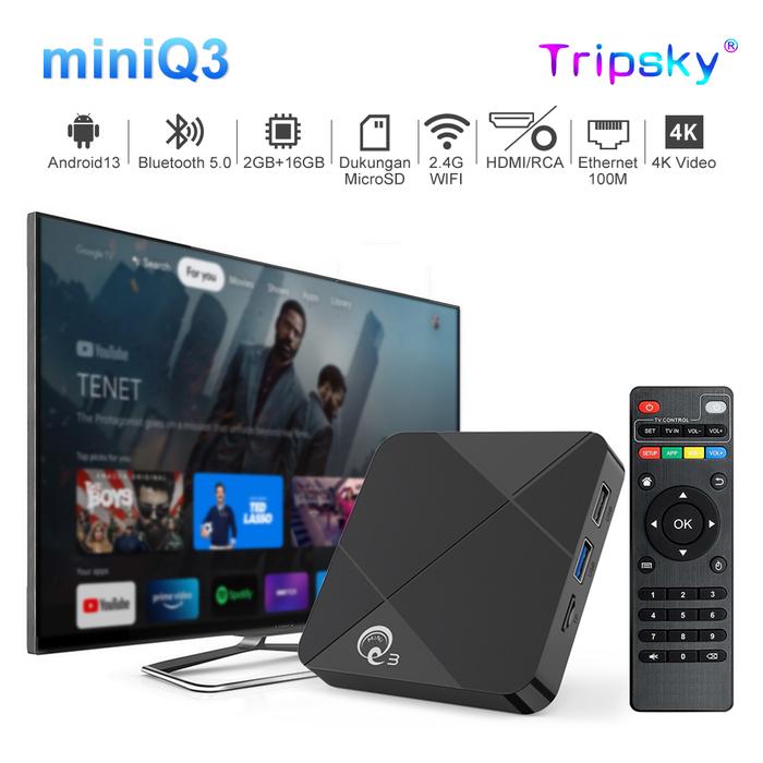 TRIPSY MINIQ3 ANDROID TV BOX ANDROID 13 PROSESOR QUAD-CORE AMLOGIC S905 RAM 2GB ROM 16GB PORT HDMI 2.0 WIFI 5G DUAL-BAND BLUETOOTH 5.0 ALAT YOUTUBE KE TV 4K UHD UNTUK TV LAMA - MINIQ3