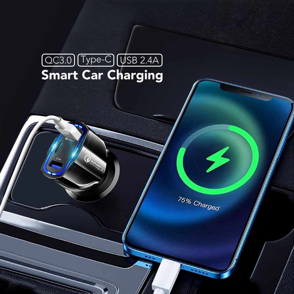 AMINO AM-C01 43W 30W Car Charger Fast Charger 3 Port USB QC 3.0 Type C Output Saver Mobil Lampu