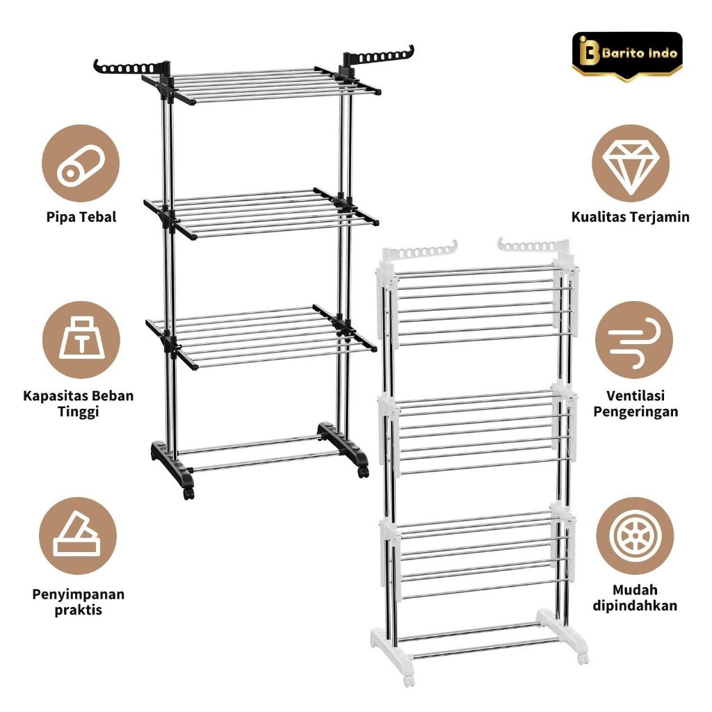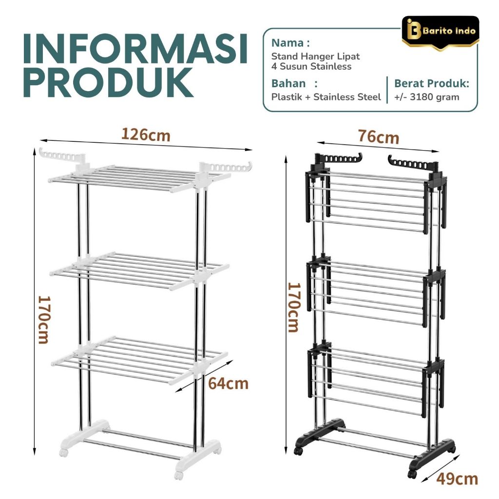 BARITOINDO Rak Jemuran Baju Lipat Roda 4 Susun Stainless Steel Anti Karat Tahan Beban 40 Kg - B03A