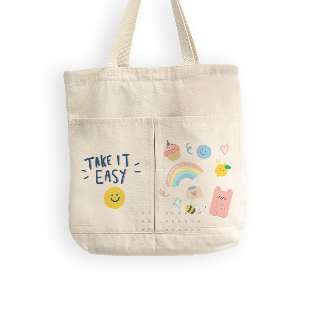Tasjalanku - Totebag Kanvas Kantong Karakter Lucu Kata Kata Motivasi dua kantong depan bisa muat laptop cocok untuk sekolah kuliah dan jalan