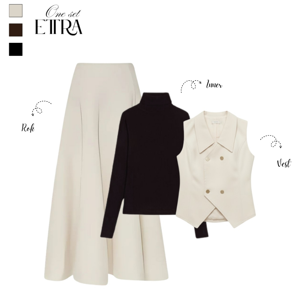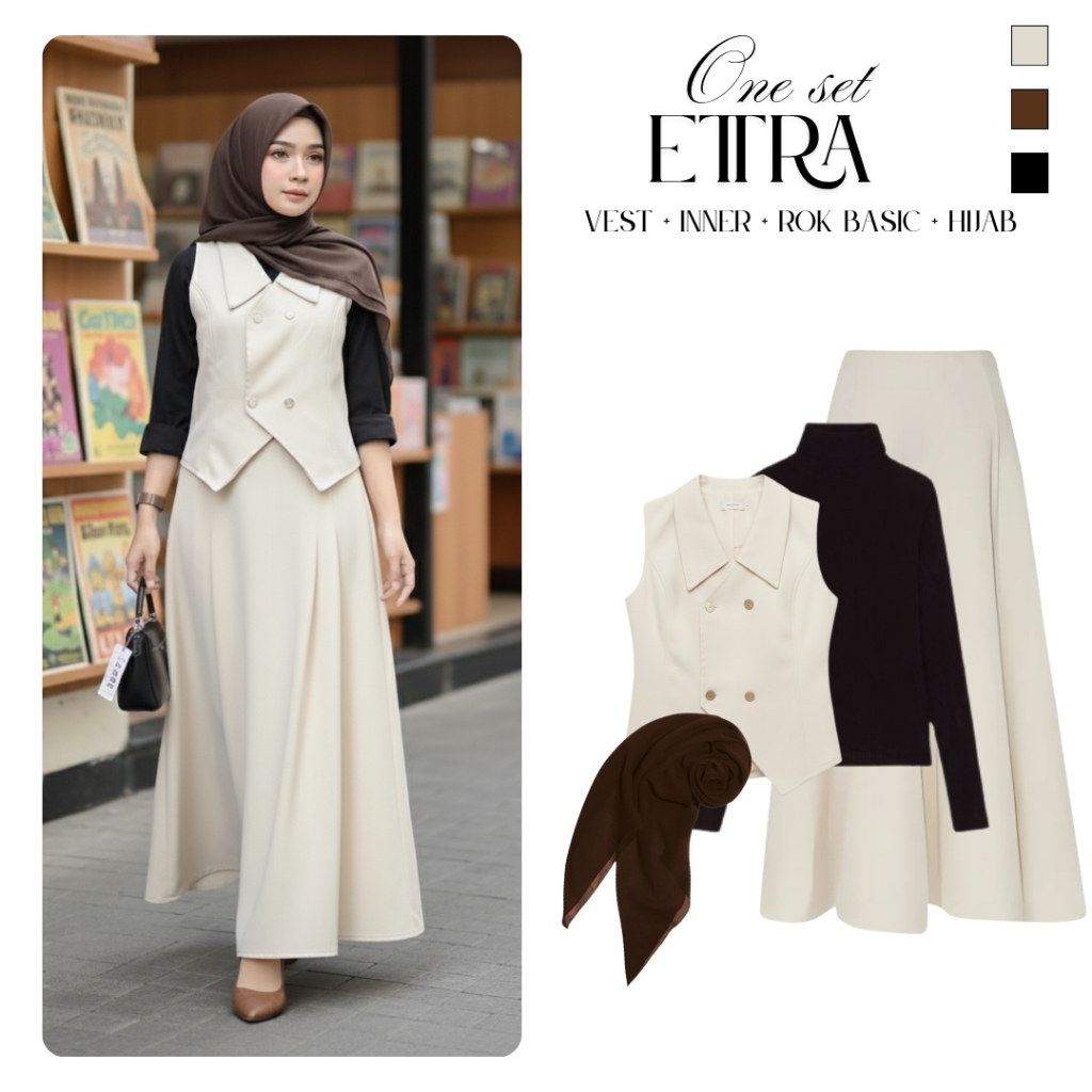 One Set Cewek 4in1 Kekinian ( Vest Evi+ Rok Basic+ Manset+ Hijab) Setelan Outfit Casual Ootd Ettra