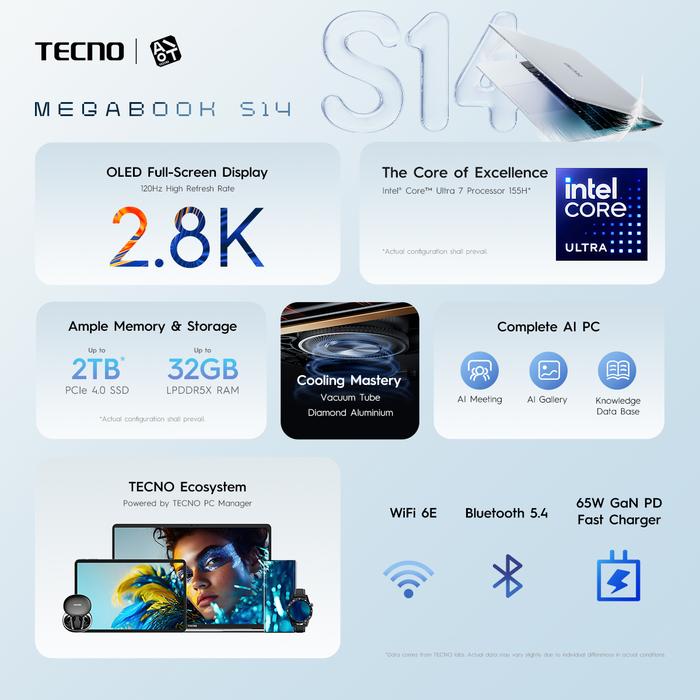 [Official Store ✔️] TECNO MEGABOOK S14 Intel Core Ultra 7 155H - 16GB+1TB, 50Wh Battery + 65W GaN Fast Charge, 14 Inch