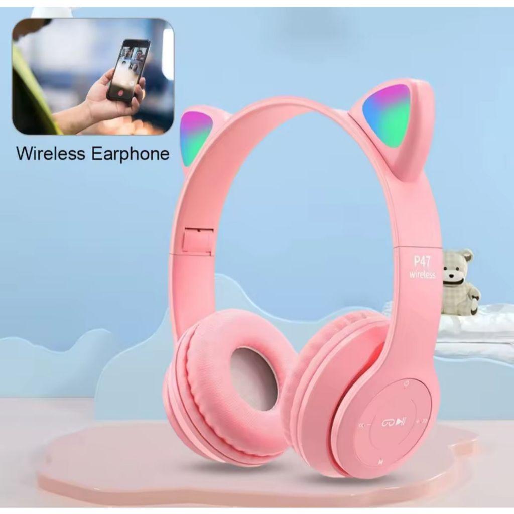 P47M Headphone Bluetooth Gaming Cat Ears Wireless RGB LED Light Super Bass Stereo Headset Bando