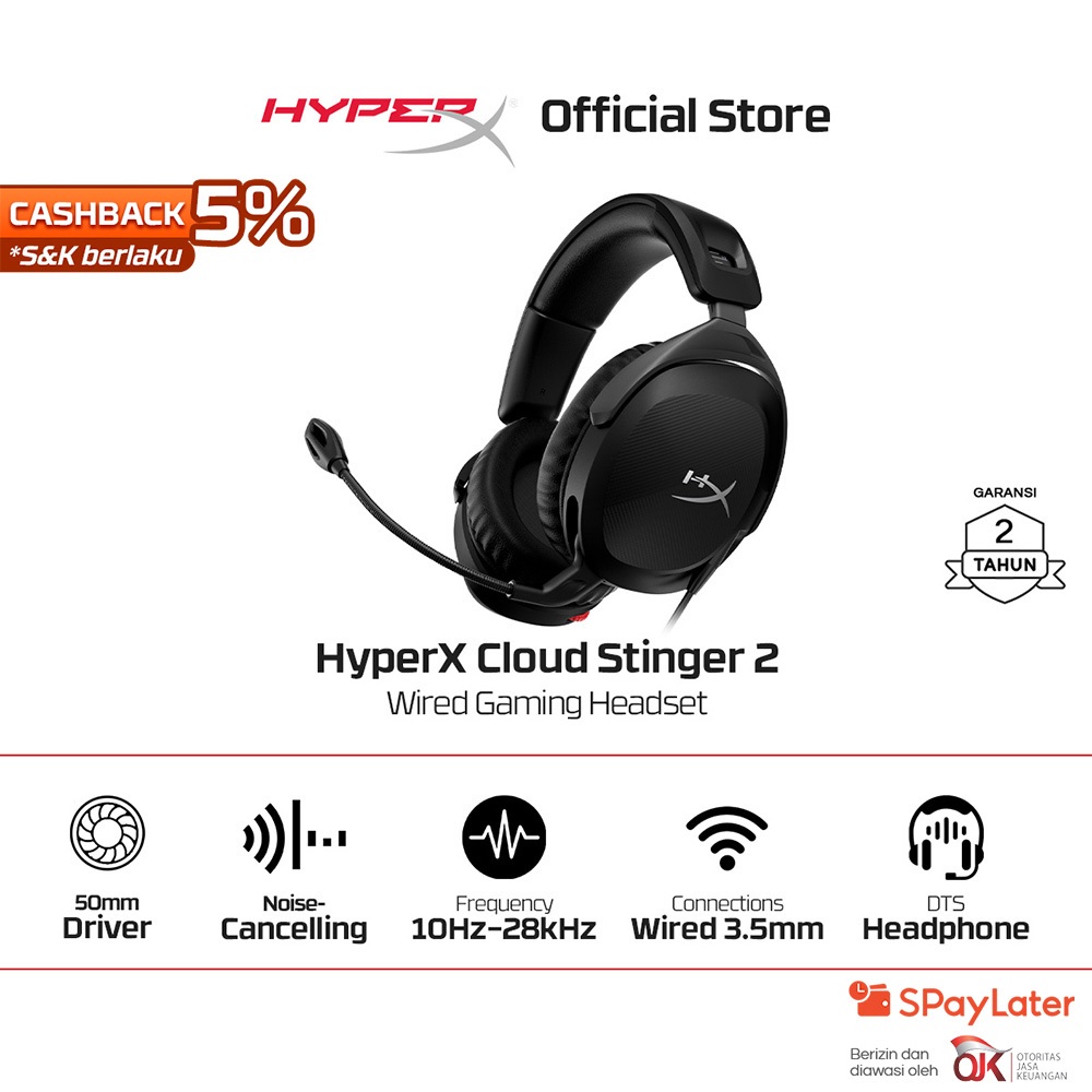 HyperX Headset Gaming Cloud Stinger 2 Wired - Black Noise Cancelling Spatial Audio Rotatable Leather Stereo Bass Android