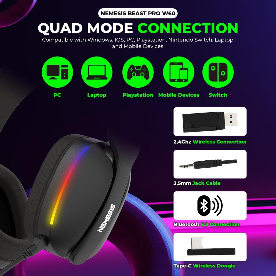 NYK Nemesis Beast Pro W60 W-60 Headphone Wireless 2.4Ghz Gaming Headset 7.1 Tri Mode Connection