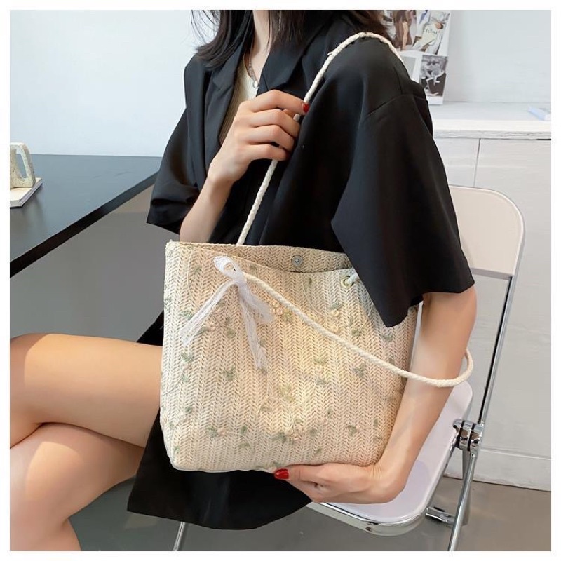 BAO034 Tas anyaman bunga renda segar dan sederhana tas pantai tas jinjing bahu gaya Barat tas besar tas bahu tas ibu tas