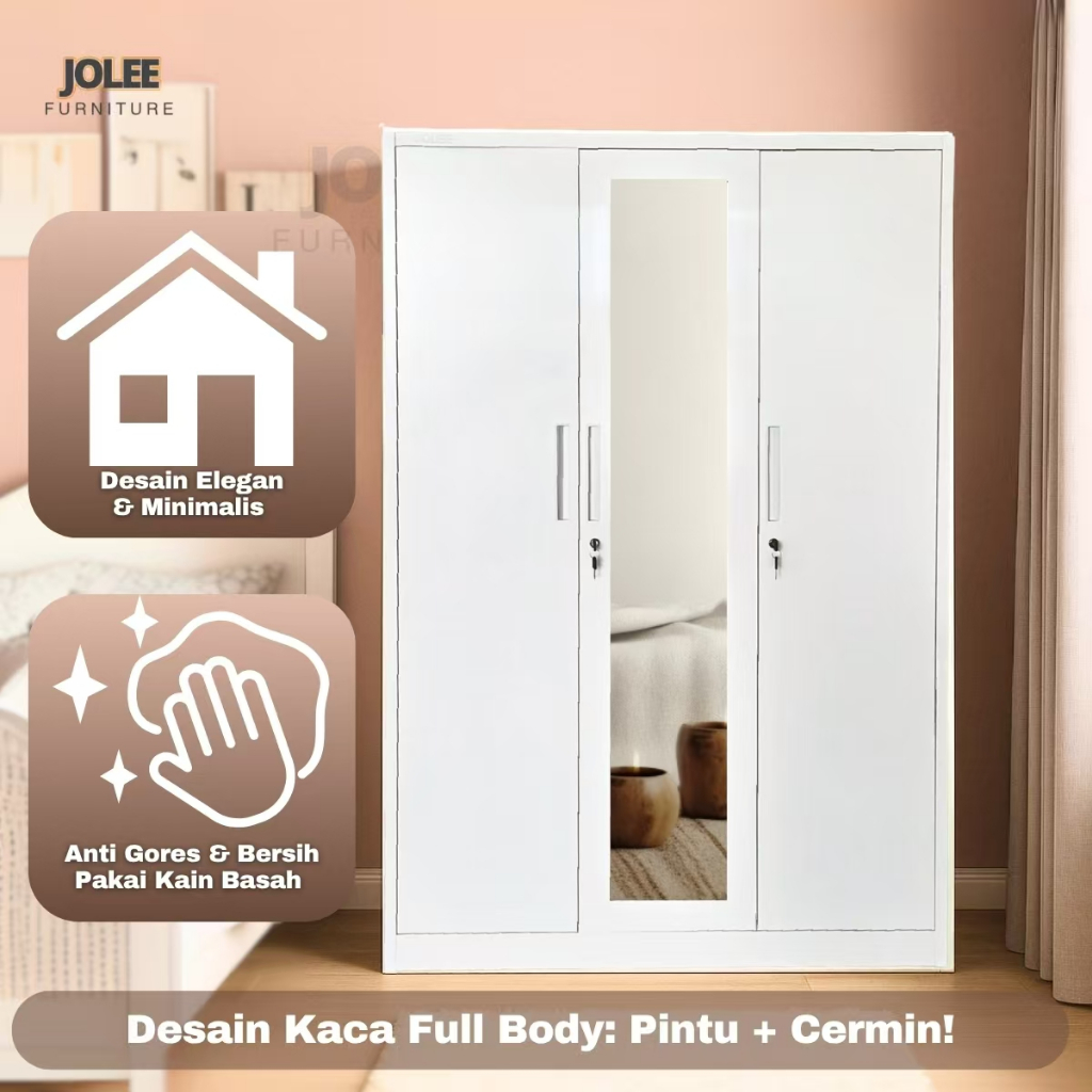 JOLEE-Lemari Pakaian Besi 3 Pintu Jumbo - 150cm 2 Laci 2 Batang Rak Baju