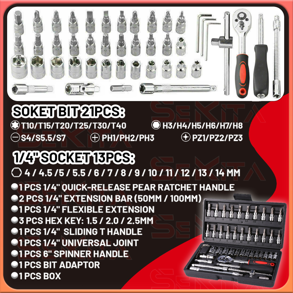 Set Kunci Sok Shock 1/4 Inch 46 Pcs Lengkap - Obeng Socket Multifungsi untuk Mobil & Motor
