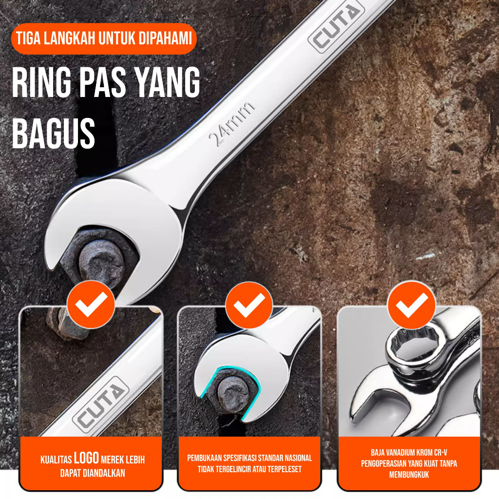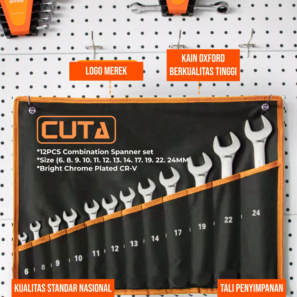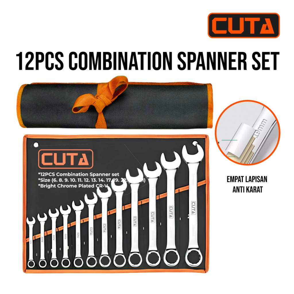 CUTA Kunci Ring Pas Set 12Pcs 6-24mm CR-V Kunci Pas Ring Set Kombinasi Spanner Mirror Finishing