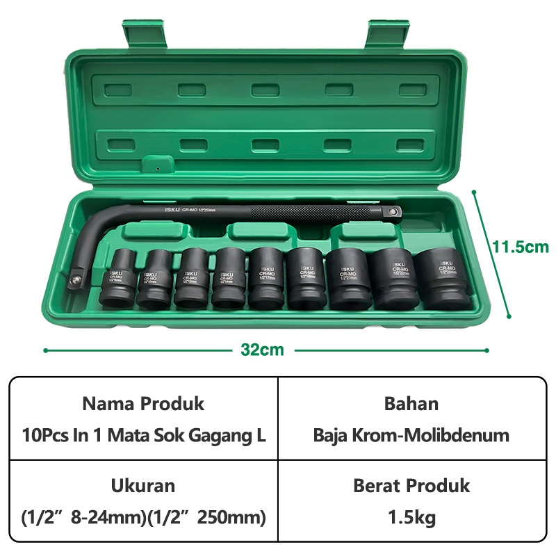 ISKU Mata kunci sok set 10Pcs Termasuk 9pcs 8-24mm 1/2 inch 6PT Mata Sock Set Dan 1pcs 1/2 Inch Gagang Sock L/Kunci Set 1/2 inch 6Pt Kunci Mata Shock Tool Kit