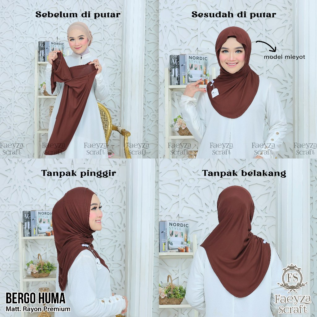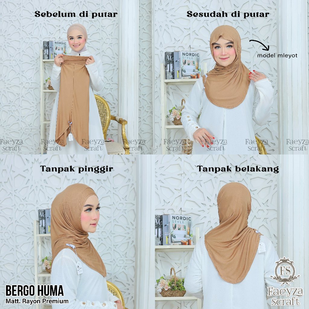 HIJAB INSTAN BERGO HUMA BAHAN KAOS RAYON COOLTECH MELEYOT PASHMINA BISA EMPAT MODEL SIZE M BERGO SIMPLE + POUCH EXCL