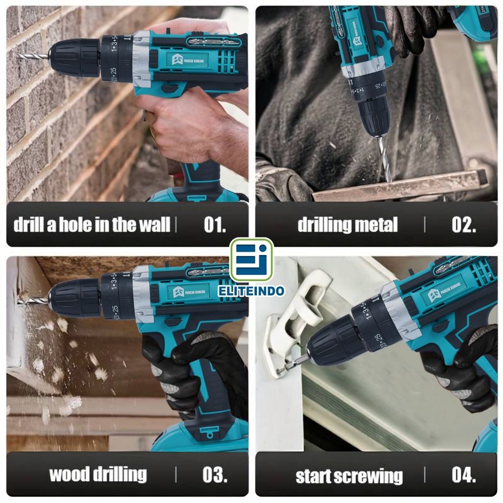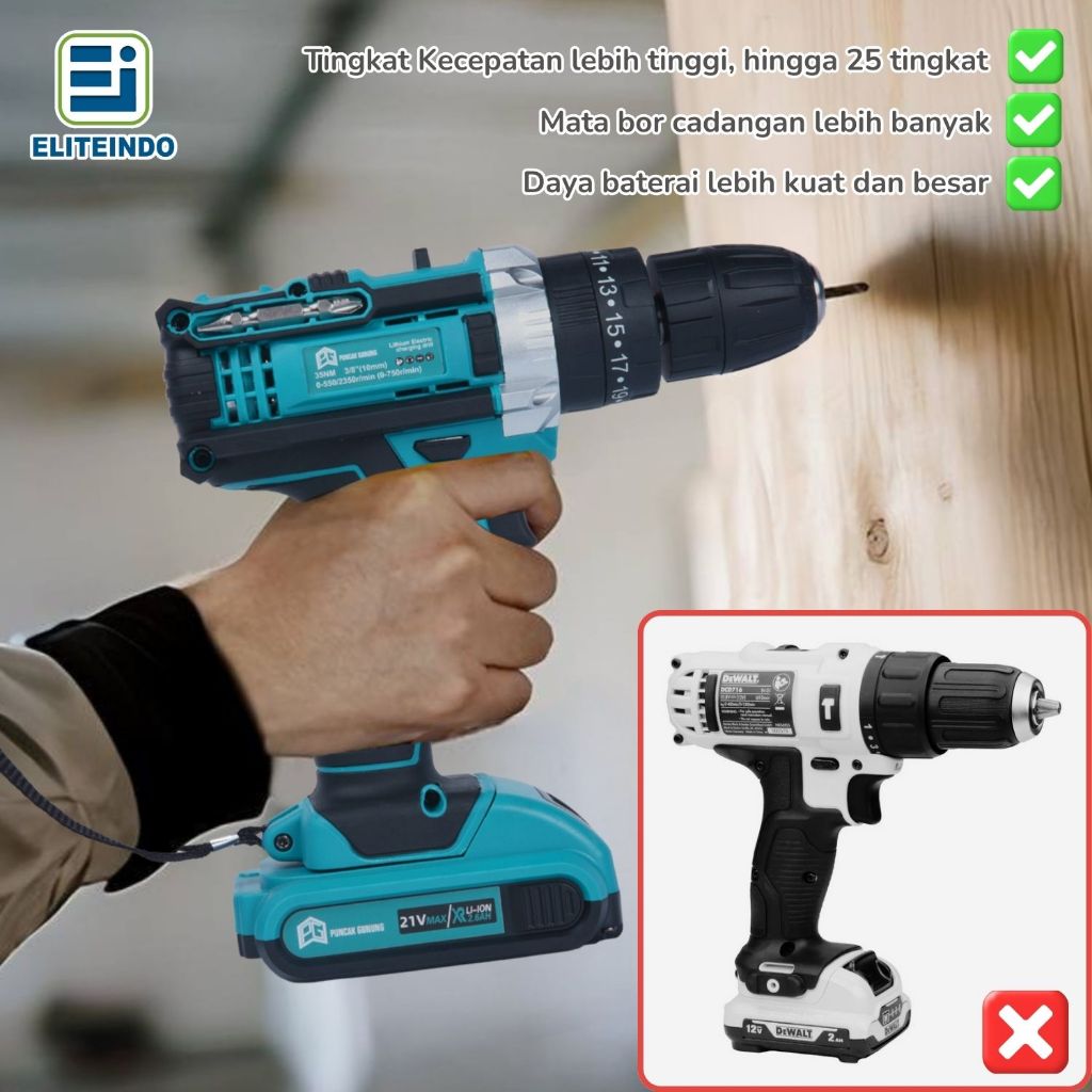 ELITE Set Mesin Bor 2 Baterai 50Pcs in 1 Toolkit Lengkap Perkakas Cordless Drill Impact Alat Listrik