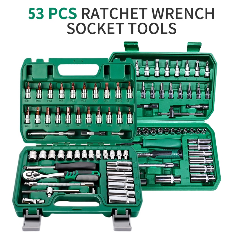 ISKU Set kunci soket 53 buah mata kunci soket Set soket 53 buah (1/4") Kit peralatan lengkap 20 buah mata kunci soket dan 21 buah mata bor Set perbaikan mobil