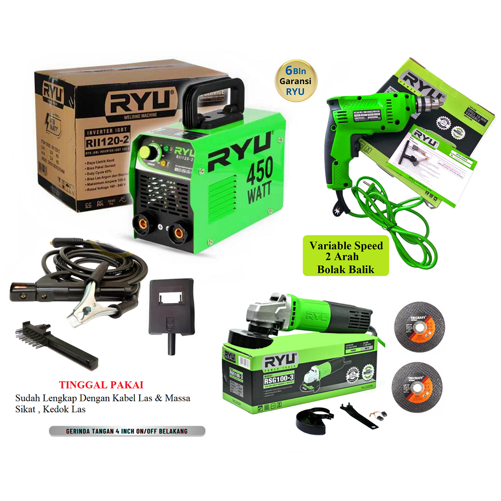 PAKET Hemat 3 ITEM Mesin Travo Las Listrik RII 120-2 450 watt Mesin Las 450 Watt RYU 120a Trafo Travo Las + Mesin Gerinda 4 inch RSG 100-3