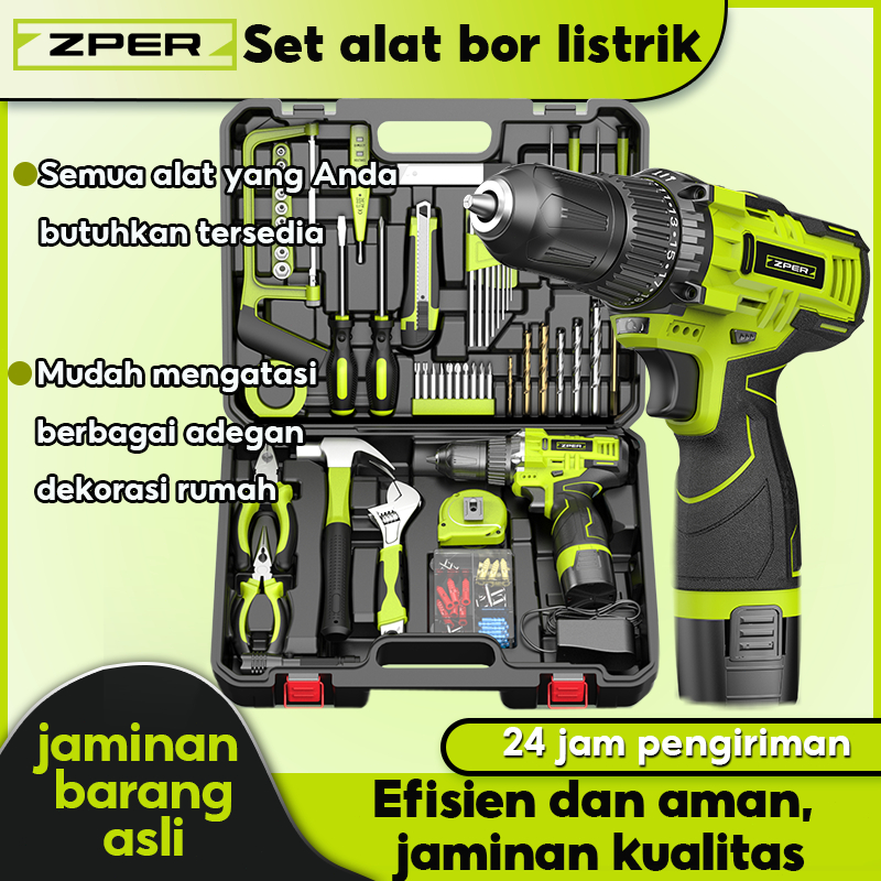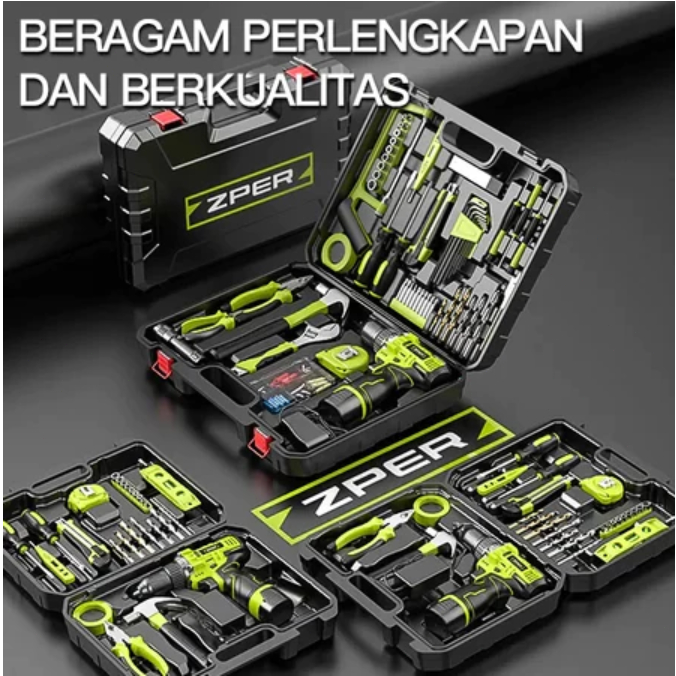 ZPER 108PCS Tool Box Besar Mesin Bor Baterai Toolkit Set Alat Tukang Bangunan Lengkap Kotak Perkakas