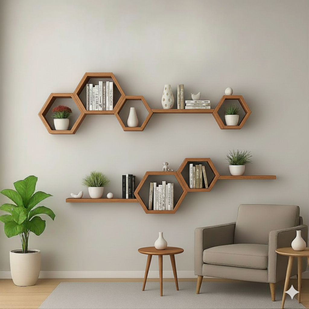 Rak Dinding 1 set hiasan hexagonal kayu jati belanda kamar tidur aesthetic pajangan ruang tamu
