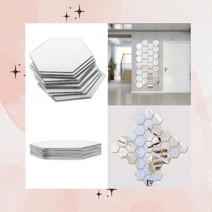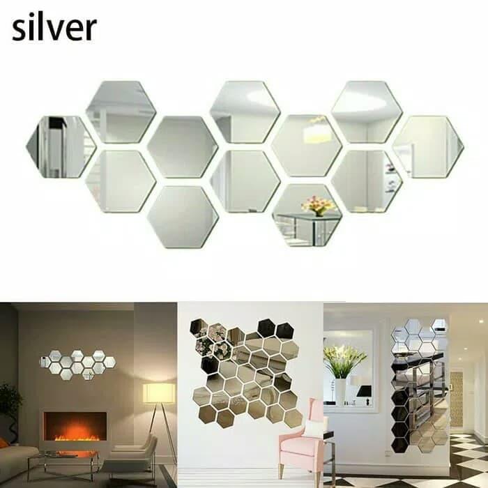CERMIN KACA HEXAGONAL MIRROR DEKORASI HIASAN DINDING STICKER KACA HEXAGON CERMIN MURAH - 12 PCS KACA