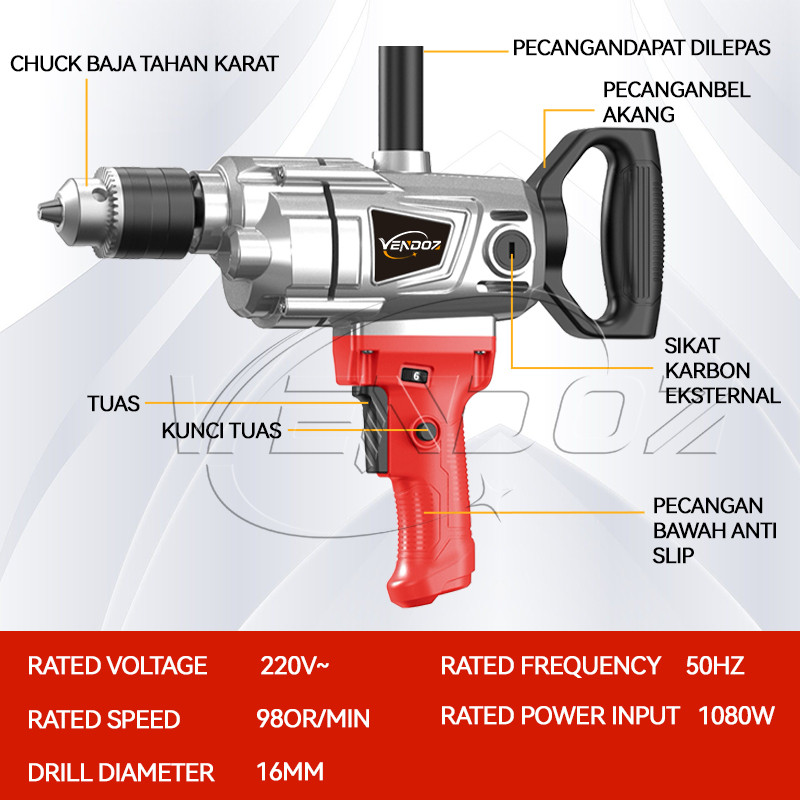 Vendoz Electric Drill Mesin Bor Mixer Pengaduk Cat Atau Semen Multifungsi Artio