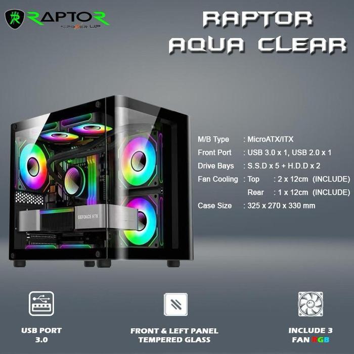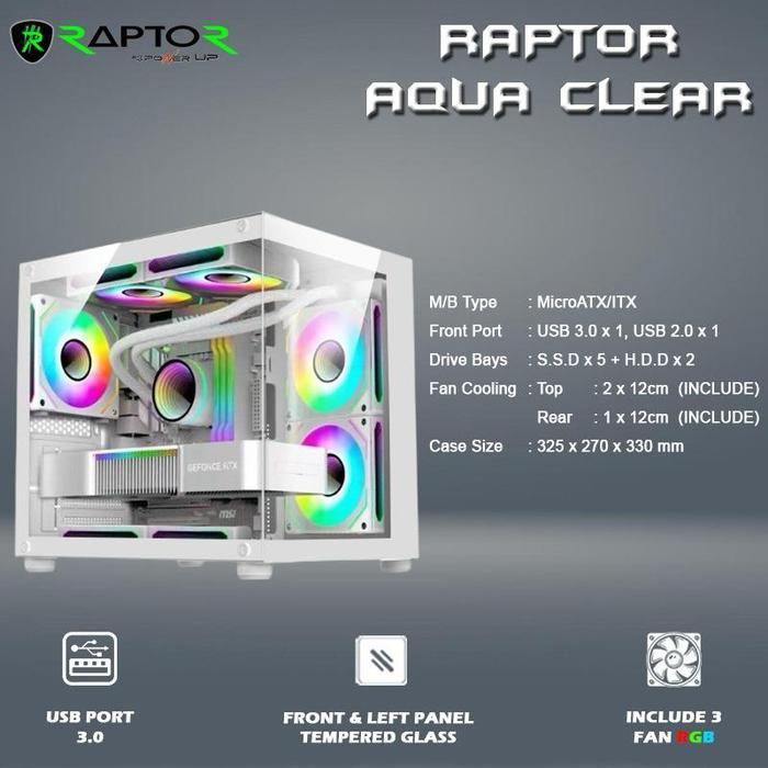 Raptor Aqua Clear Casing Komputer Gaming M-ATX Include 3 Fan RGB